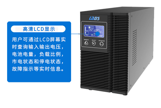 用戶可通過LCD屏幕實時查詢輸入輸出電壓,電池電量,負載比例,市電狀態(tài)和停電狀態(tài),故障指示等實時信息。