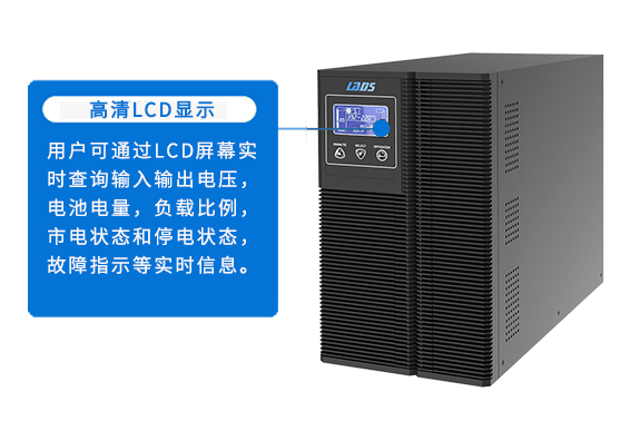 用戶可通過LCD屏幕實(shí)時查詢輸入輸出電壓,電池電量,負(fù)載比例,市電狀態(tài)和停電狀態(tài),故障指示等實(shí)時信息。